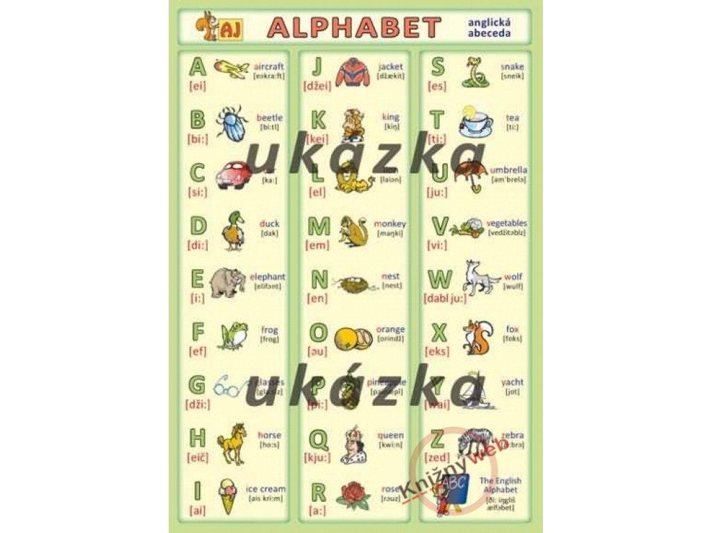 Obrázková anglická abeceda s prepisom výslovnosti a veselým obrázkom pri každom písmenku.precvičovanie hláskovania