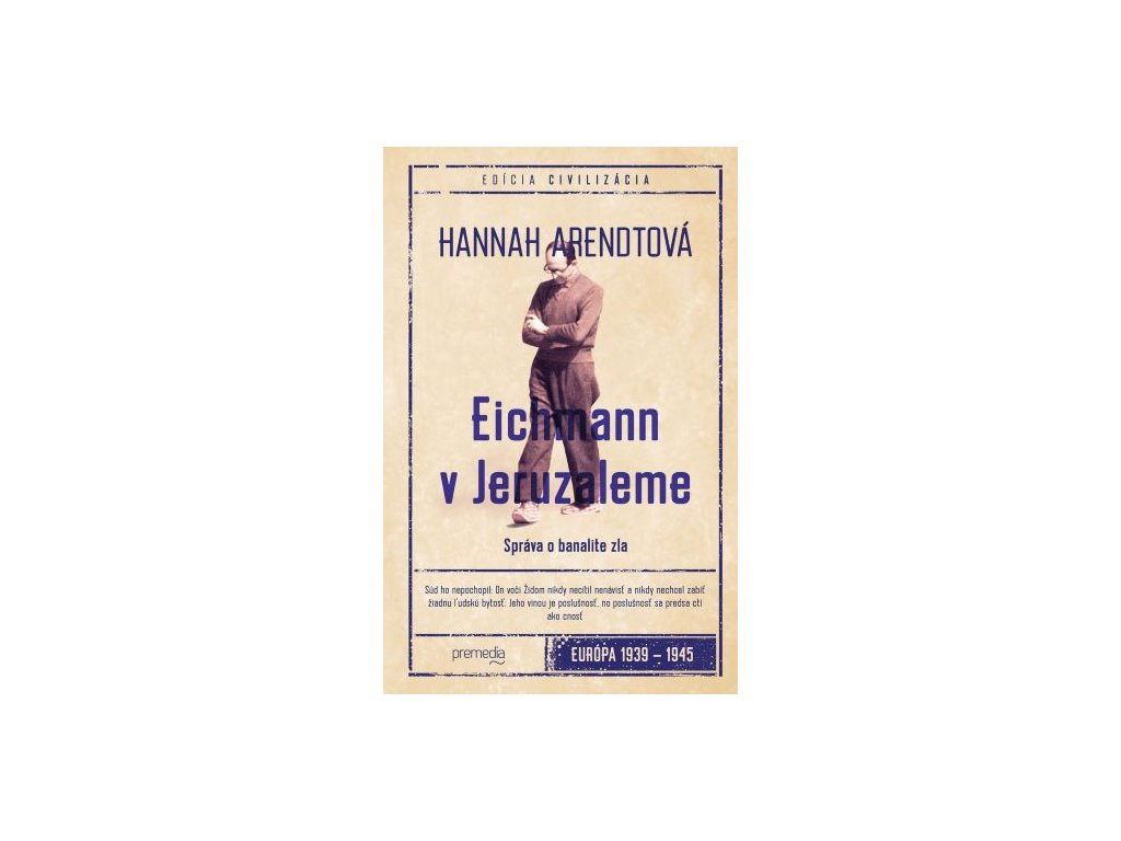 Kniha o súdnom procese s nacistickým zločincom Adolfom Eichmannom v roku 1961 vyvolala v čase svojho prvého vydania veľký záujem, ale aj pobúrenie. Eichmanna uniesli z Argentíny do Izraela, kde bol obvinený, že bol jedným z hlavných strojcov konečného riešenia židovskej otázky. Kniha koncipovaná ako reportáž je zároveň historickým svedectvom, filozofickou úvahou a pojednaním o rôznych výkladoch práva. Opakuje sa v nej dilema z norimberských procesov, kde sa obžalovaní obhajovali tým, že len poslúchali rozkazy. Arendtová napísala nepohodlnú knihu. Jej portrét Eichmanna nezodpovedal tradičnej predstave vojnového zločinca ako psychopata a brutálneho vraha, namiesto toho tu máme podivný produkt svojej doby s dušou byrokrata. Vášnivé diskusie vyvolali jej pasáže o židovských radách, ktoré sa svojim spôsobom podieľali na hladkom priebehu likvidácie židovského obyvateľstva. Tretí problém sa týkal jej kritiky samotného procesu a spôsobu, akým bol vedený. Dnes, s odstupom šesťdesiatich rokov, kniha patrí medzi najvýraznejšie míľniky v uvažovaní nielen o holokauste, ale aj o rizikách modernej spoločnosti.Dodatočné parametre