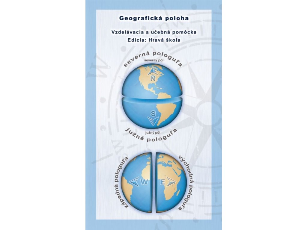 Vzdelávacia a učebná pomôcka z edície Hravá škola. Vzdelávacia a učebná pomôcka pre prírodovedné predmety. Učebná pomôcka graficky vysvetľuje absolútnu a relatívnu geografickú polohu.Ide o úplne netradičný produkt v tzv. mapovom formáte, v rozloženom stave má titul rozmer 98 cm x 62 cm, v zloženom stave má rozmer 21 cm x 12,5 cm.