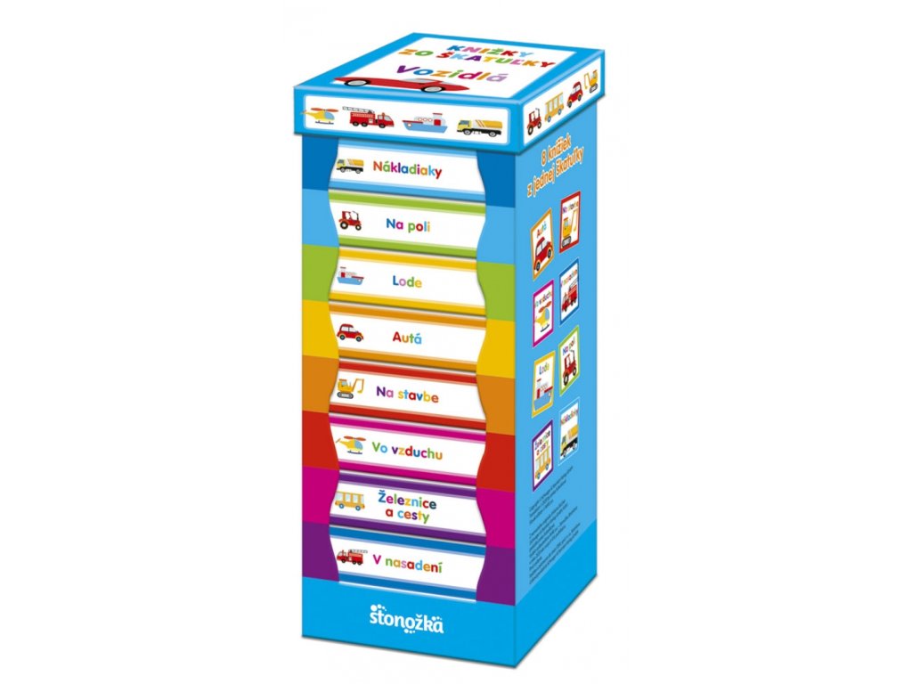 S pomocou ôsmich knižiek z praktickej škatuľky spoznajú detičky výkonné traktory, rýchle požiarnické autá či silný bager. Rozšíria si slovnú zásobu a precvičia vnímanie okolitého sveta a komunikáciu.