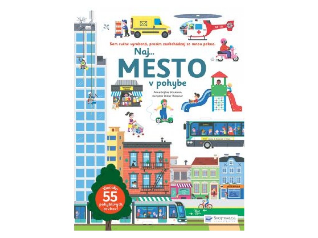 Vitaj v meste! Vďaka odklápacím okienkam, výsuvným a posuvným obrázkom, otáčacím kolieskam a ďalším pohyblivým prvkom celá metropola ožije! Preskúmaj mesto do najmenších detailov. Pusť sa do objavovania všetkého mestského ruchu a zhonu. Prejdi sa hromadnou dopravou, navštív obchodný dom a zavítaj do kancelárií v presklených budovách. Tak ako sa dá v naozajstnom veľkomeste, aj v tejto naj... knihe, ktorá obsahuje viac ako 55 pohyblivých prvkov, môžeš veľa vidieť. Pomôž sanitke dostať sa k miestu nehody, Prejdi sa výťahom hore a dolu a preskúmaj múzeum. V tejto knihe je všetko, čo chceš v meste spoznať. Ponúka ti dlhé hodiny hrania a objavovania! Kniha je vyrobená ručne. Aby pohyblivé prvky dlho vydržali, vyžaduje jemnejšie zaobchádzanie.Dodatočné parametre