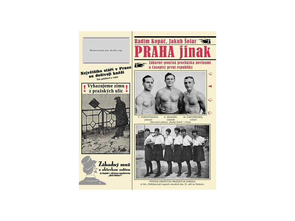 Praha jinak, Praha „jinohledem“. Praha poskládaná jako noviny z éry mezi dvěma válkami. Dramaticky i vesele. Informačně a zábavně. Slovem i obrazem. Kolážovaný dokument doby, kdy se dělaly moderní česk(oslovensk)é dějiny. Co se tehdy o městě psalo, co se tady dělo, jak se měnila řeč, jak se měnila vizualita míst? To všechno přehledně ve dvanácti třaskavě nabitých kapitolách: první strana, z domova, ze zahraničí, společnost, kultura, sport, zdraví, zábava, móda, černá kronika, inzerce – a samozřejmě literární příloha. A spíš než středem jede tato kniha po okrajích, po výjimkách, po periferii. Prostě jinak. Poznejte jak!Dodatočné parametre