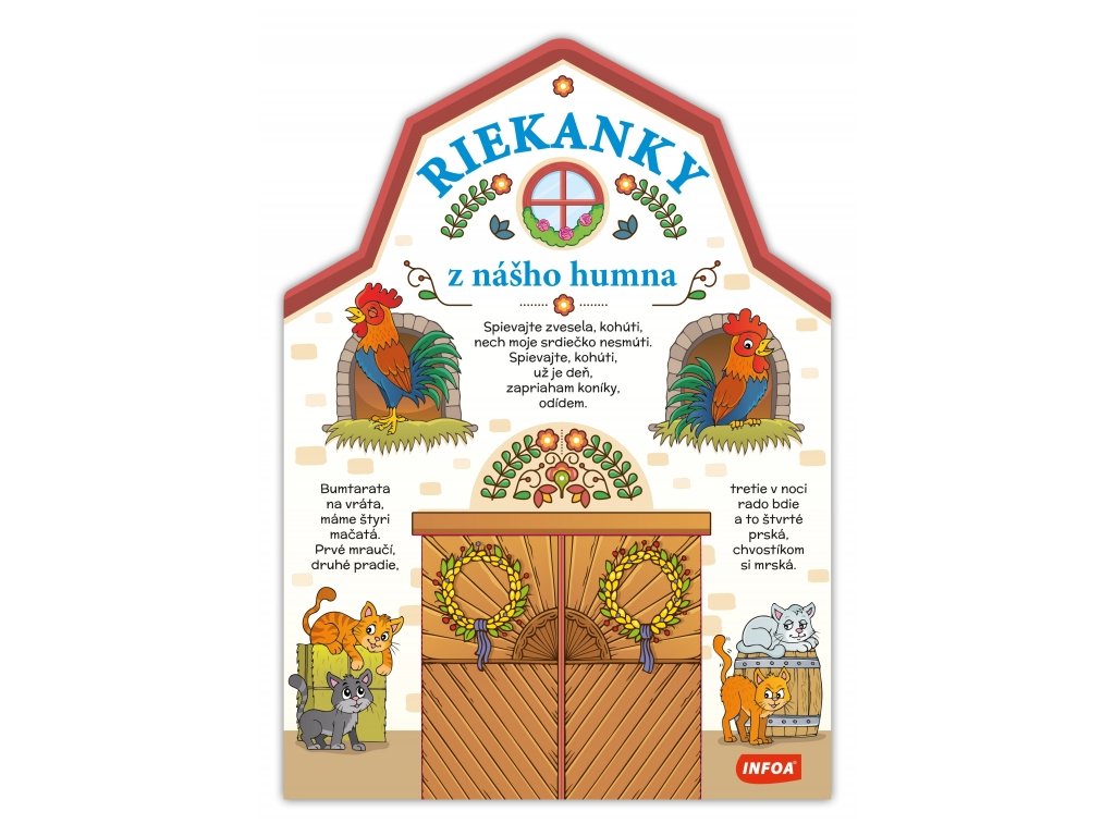 Veľké harmonikové leporelo plné veselých zvieratiek a postavičiek na obrázkoch so známymi ľudovými riekankami. Knižku je navyše možné poskladať do tvaru domčeka na hranie alebo použiť ako dekoráciu do detskej izbičky.Dodatočné parametre